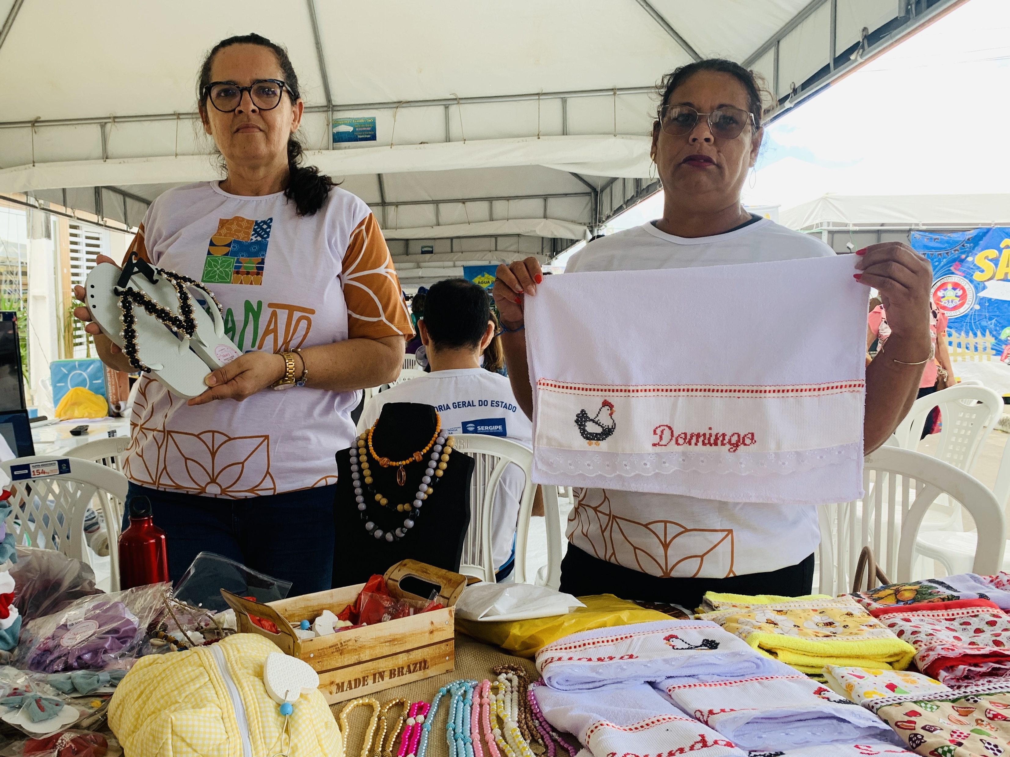 As artesãs Tatiana Lima Santana e Mariel da Cruz também comemoraram a oportunidade de expor produtos feitos por ela, como panos de prato, jogo de banheiro e passadeiras de mesa. “É uma oportunidade importante porque, como moramos no interior, é difícil expor e vender sem apoio”, explicou Tatiana. Já Mariel levou laços bordados à mão, colares e chaveiros. “Estamos achando maravilhoso porque temos visibilidade. É uma chance que valorizamos muito”, acrescentou Mariel. Ambas moram no povoado Três Barras, no município de Cardoso, e fazem juntas as produções.